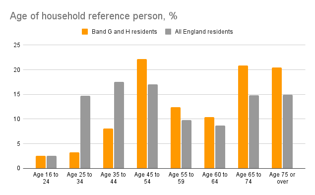 One source of data which can answer these questions is the Family Resources Survey (FRS) – a detailed dataset of household finances and demographics. Critically, the FRS contains information on a household’s Council Tax band. And with a sample of close to 12,000 households across England, including about 500 band G and H residents, it can shed light on who lives in these homes.