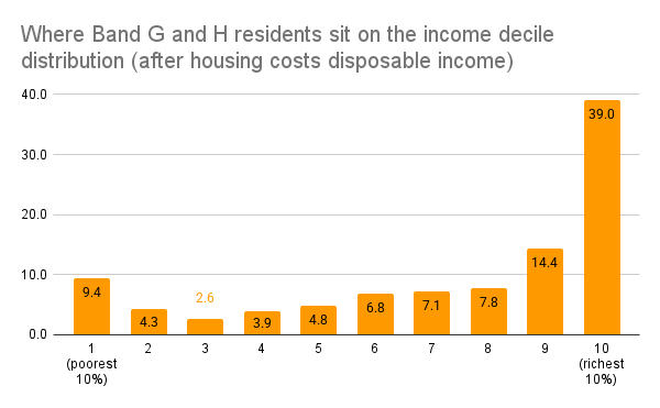 Our analysis suggests that the median household income (after housing costs) for band G and H residents is £62,400 per year. This is close to double the England-wide median of £32,500. Undoubtedly, this is a relatively affluent group on average, albeit perhaps not so affluent as to be described as “rich”.